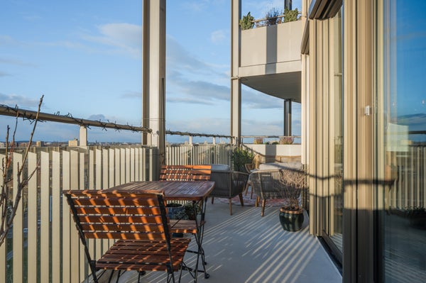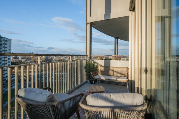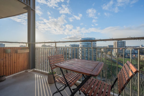 Het appartement bevindt zich op de 10e verdieping en biedt een fraai uitzicht over de groene omgeving. Dankzij de grote raampartijen is er veel natuurlijk licht en het balkon op het westen is een heerlijke plek om na een werkdag te ontspannen en te genieten van de middag- en avondzon.