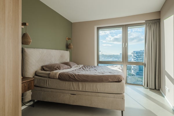 10th floor: The entrance leads to the hall with the meter cupboard and a modern toilet with a hand basin. From the hall, you can access the spacious indoor storage room and a separate utility/laundry room, which houses the washing machine and dryer, the heat pump, and the heat recovery system. The modern and attractive bathroom is luxuriously appointed and features a wooden vanity with two sinks, bronze-colored faucets, and two heated mirrors. The spacious walk-in shower also includes a matching bronze rain shower head and hand shower, as well as an electric towel radiator. The apartment has two well-sized bedrooms. The living room is spacious, bright, and tastefully decorated. A custom-made cabinet with an electric built-in fireplace with heating options forms a stylish focal point of the space. The sunny west-facing balcony is accessible from the living room, a wonderful place to relax and enjoy the view. The modern open-plan kitchen features a cooking and sink island and is finished in a warm wood tone with a polished concrete worktop. The kitchen is fully equipped with an induction hob with integrated extractor, Quooker, refrigerator, freezer, combination oven/microwave and a dishwasher.