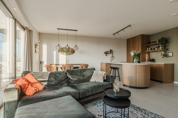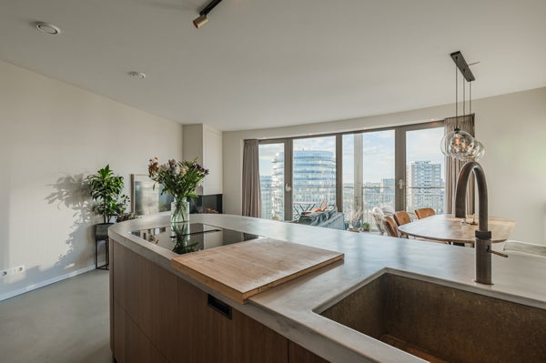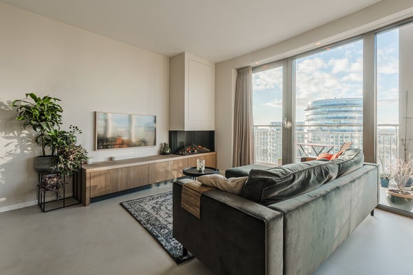 10e verdieping: via de entree kom je in de hal met de meterkast en een modern toilet met fontein. Vanuit de hal zijn de royale inpandige berging en een aparte technische/wasruimte bereikbaar, met opstelling voor wasmachine en droger, de warmtepomp en het WTW-systeem. De moderne en sfeervolle badkamer is luxe uitgevoerd en beschikt over een houten badkamermeubel met twee waskommen, bronskleurige kranen en twee verwarmde spiegels. De ruime inloopdouche is voorzien van tevens bijpassende bronskleurige regendouche en handdouche, en daarnaast is er een elektrische handdoekradiator. Het appartement telt twee goed bemeten slaapkamers. De woonkamer is royaal, licht en sfeervol ingericht. Een op maat gemaakte kast met elektrische inbouwhaard met verwarmingsmogelijkheid. Dit geheel vormt een stijlvol middelpunt van de ruimte. Via de woonkamer is het zonnige balkon op het westen bereikbaar, een fijne plek om te ontspannen en van het uitzicht te genieten. De moderne open keuken is uitgevoerd met een kook- en spoeleiland en afgewerkt in een warme houttint met een beton ciré werkblad. De keuken is compleet uitgerust met een inductiekookplaat met geïntegreerde afzuiging, Quooker, koelkast, vriezer, combi oven/magnetron en een vaatwasser.