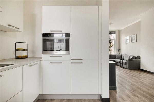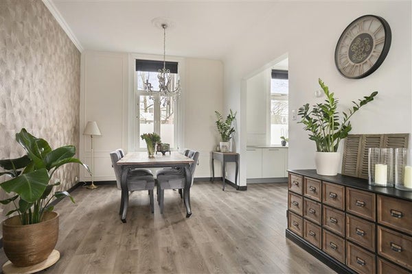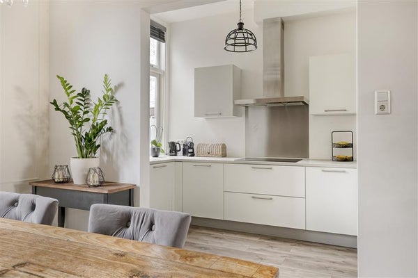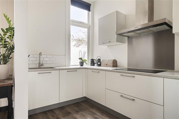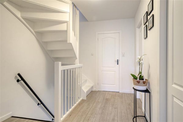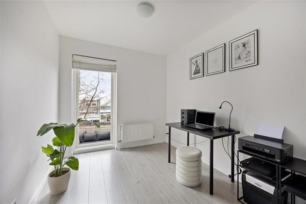 Eerste verdieping: op de eerste verdieping heb je toegang tot het toilet, een handige kamer aan de voorzijde (ideaal voor thuiswerkplek of garderobe) en de woonkamer. De woonkamer geniet door de grote raampartijen van veel licht, beschikt over een hoog plafond en staat in open verbinding met de keuken. De keuken is voorzien van diverse moderne inbouwapparatuur, te weten: een koel-/vriescombinatie, een oven, een vaatwasser en een inductiekookplaat.