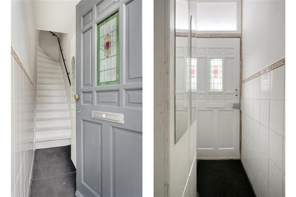 Begane grond: entree, hal met eigen opgang en trap naar...