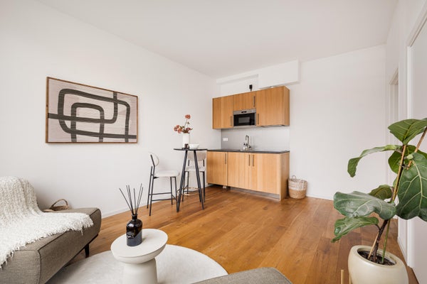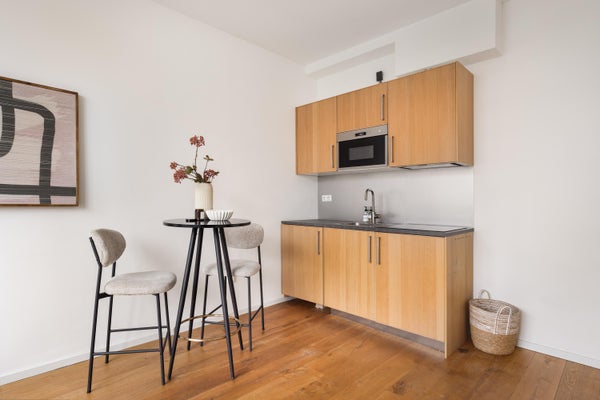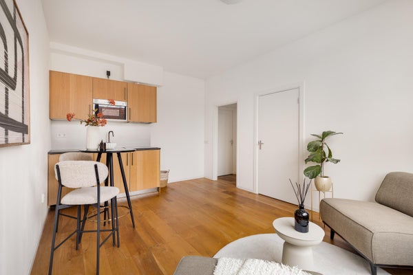 Entree woning, hal, woonkamer met moderne open keuken, badkamer met douche, wastafel + meubel en toilet. Aparte slaapkamer. De wasmachineaansluiting bevindt zich in de woonkamer/keuken.
