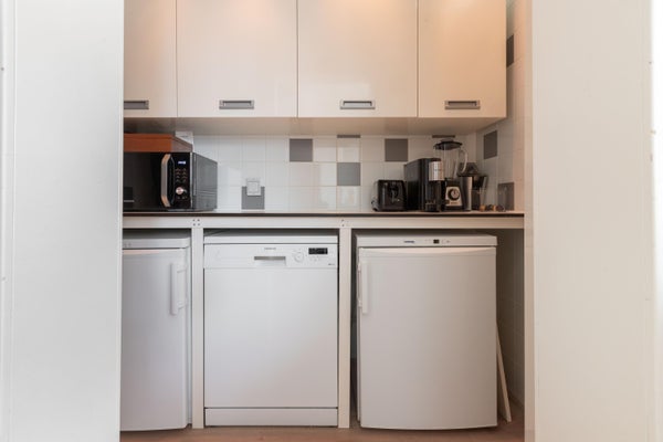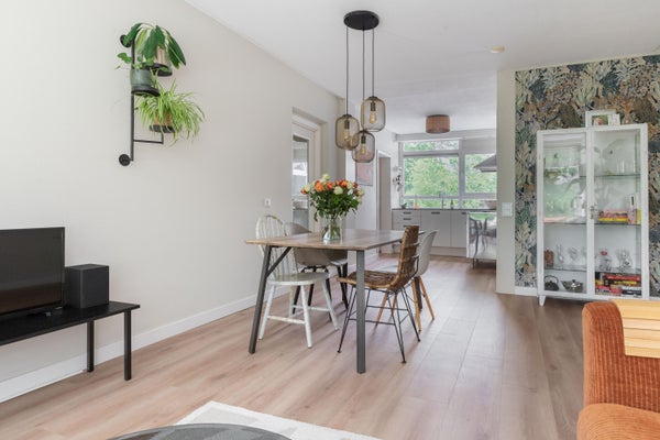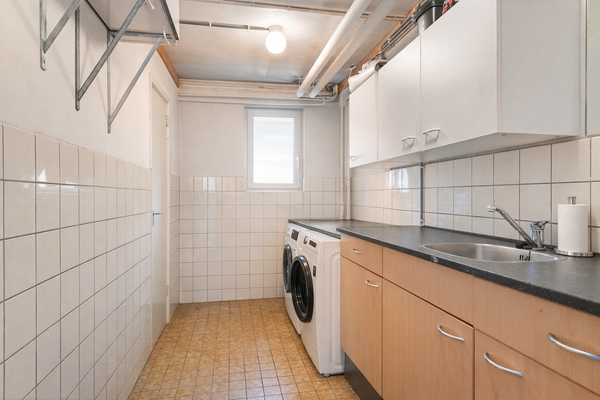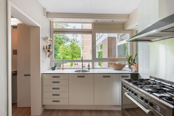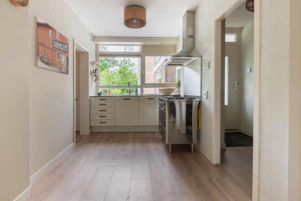 1e verdieping: via een afgesloten deur in het voorportaal dat wordt gedeeld met de buren kom je bij de entree. Achter de voordeur tref je de hal met garderobe en meterkast. Aangrenzend een ruime woonkamer met open keuken. Wat meteen opvalt is de hoeveelheid licht en het prachtige vrije uitzicht, dankzij de grote raampartijen. De keuken is gelegen aan de voorzijde en voorzien van een vrijstaand gasfornuis met oven en voldoende kastruimte. Grenzend aan de keuken bevindt zich de bijkeuken welke voorziet in nog meer opbergruimte een losse koelkast, vriezer, magnetron en vaatwasser.