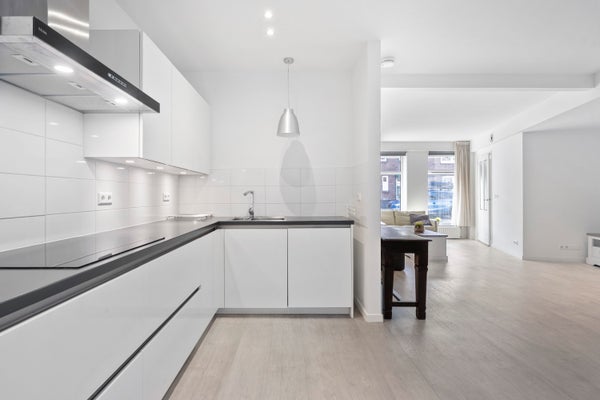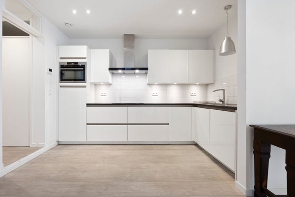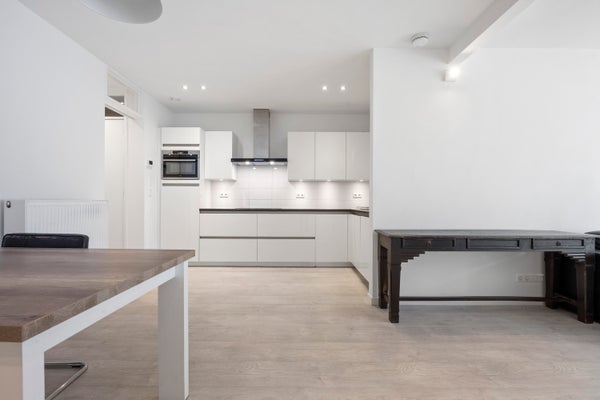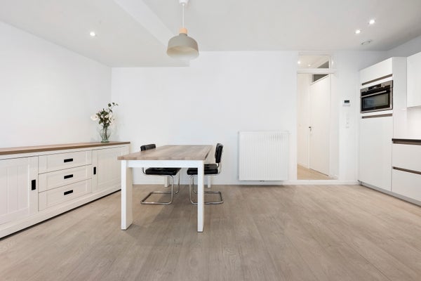 Vanuit de hal bereikt u de lichte en ruime woonkamer met een prettig zitgedeelte en een apart eetgedeelte. Aangrenzend bevindt zich de hoekkeuken, voorzien van diverse inbouwapparatuur, waaronder een vaatwasser, inductiekookplaat, koelkast met vriezer en een combi-oven.
