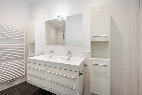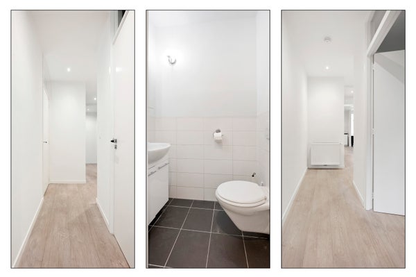 Via the intermediate hallway, you can access the separate toilet and the bathroom. The bathroom also houses the central heating boiler and the connections for a washing machine and dryer. The apartment has two spacious bedrooms, both offering ample storage space.