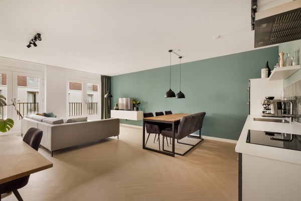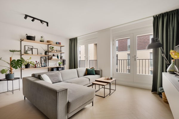 Royale lichte woonkamer voorzien van fraaie laminaat visgraat vloerafwerking met vloerverwarming (en vloerkoeling), gestuukte wanden, Frans balkon (op het zuiden) en openslaande deuren.