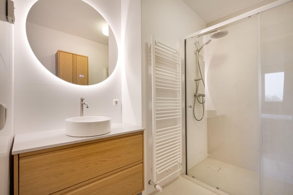 Luxe badkamer met inloopdouche, wastafelmeubel, vloerverwarming en designradiator.