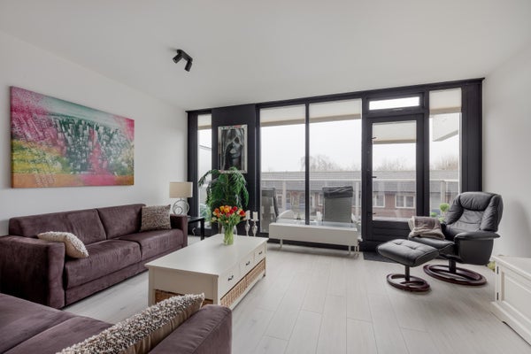 3e etage: entree, hal/gang. De ruime woonkamer is heerlijk licht door de grote ramen en is voorzien van glad gestucte wanden en een geísoleerde laminaat vloer. Vanuit de woonkamer kun je het riante, op het westen gelegen balkon bereiken. Doordat er geen balkon er boven gelegen is, kun je nog langer van het zonnetje genieten. De moderne keuken is in hoekopstelling geplaatst en voorzien van diverse inbouwapparatuur. De ruime master bedroom is ook voorzien van glad gestucte wanden en een laminaatvloer, net als de ruime 2e slaapkamer. De woning heeft een separaat modern, zwevend toilet. De moderne badkamer is voorzien van een inloopdouche en een wastafelmeubel. Kast met de aansluiting wasmachine.