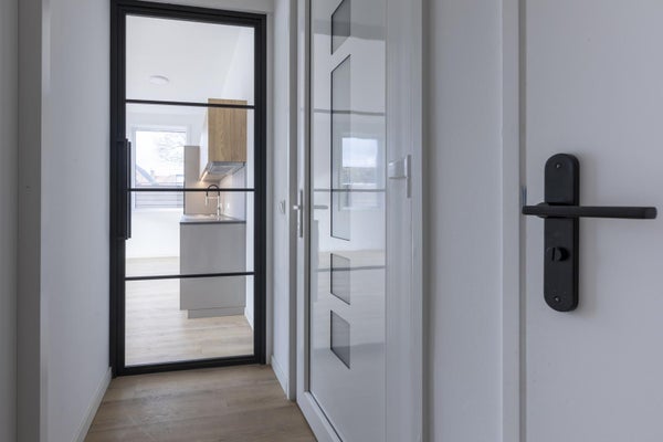 Aan de zijkant van het gebouw bevindt zich de gezamenlijke entree met toegang tot de appartementen.