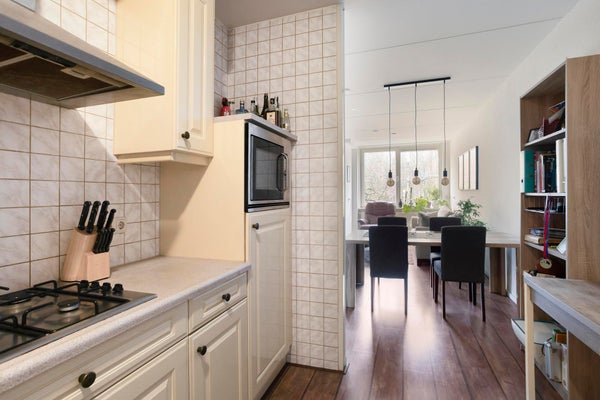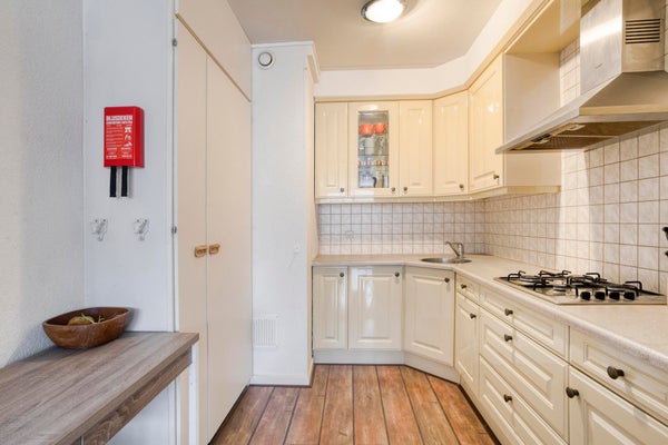 - Semi-open keuken voorzien van 4-pits gasfornuis, afzuigkap, koelkast, combimagnetron en veel kastruimte. De CV-installatie is netjes weggewerkt in een muurkast.