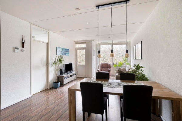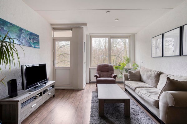 - Lichte woonkamer met uitzicht op het groen en toegang tot het balkon – een fijne plek om te ontspannen.