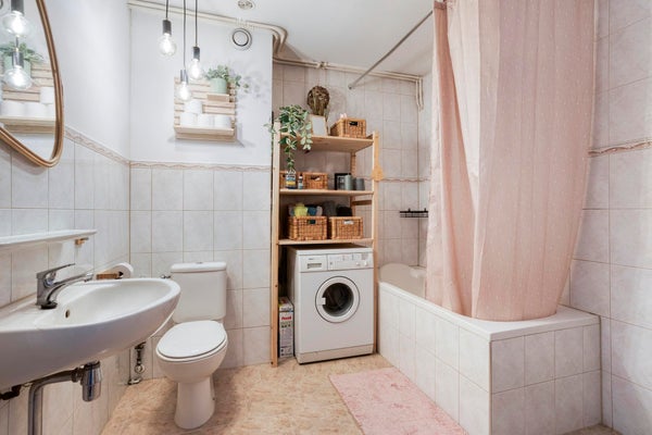 - Badkamer met ligbad, wastafel, toilet en wasmachine-aansluiting. De badkamer is zowel via slaapkamer 1 als via de hal/gang te bereiken. Dit biedt de mogelijkheid om de deur in de slaapkamer niet te gebruiken en in plaats hiervan extra opbergruimte in de slaapkamer te creëren.