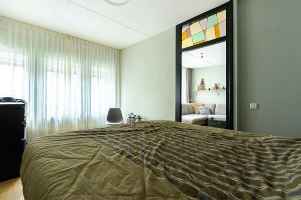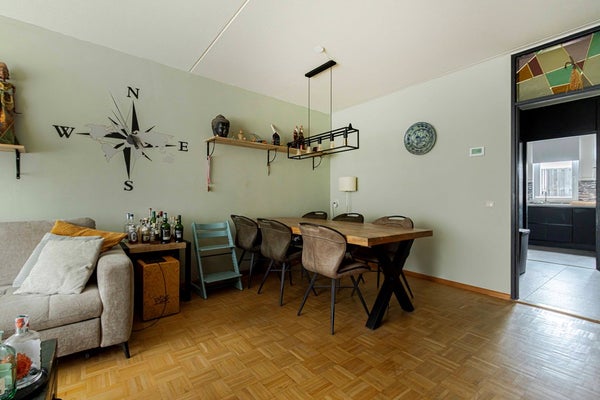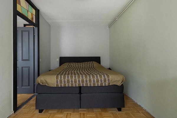 De woonkamer is gelegen aan de voorzijde van de woning en biedt uitzicht op de straat. De ruimte is sfeervol afgewerkt met een prachtige authentieke tussendeur voorzien van glas-in-lood en een warme mozaïekparketvloer, wat zorgt voor karakter en een tijdloze uitstraling. De woonkamer heeft een oppervlakte van ca. 27 m² en biedt volop ruimte voor een comfortabele zithoek en een gezellige eethoek. Vanuit de woonkamer is de tweede slaapkamer bereikbaar. De slaapkamers hebben een oppervlakte van ca. 12 m² en ca. 6 m². Eén slaapkamer ligt aan de voorzijde, de andere aan de achterzijde van de woning. Ideaal voor gebruik als hoofdslaapkamer, logeerkamer of thuiswerkplek. Beide slaapkamers zijn voorzien van dezelfde mozaiïek parketvloer.