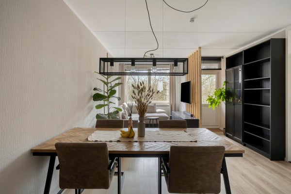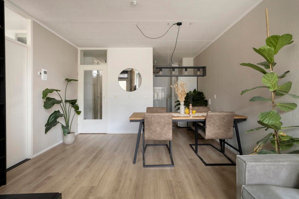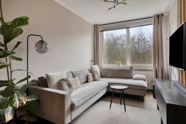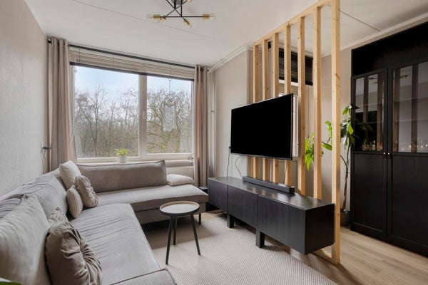 - De lichte woonkamer, met uitzicht op het groen, biedt toegang tot het (deels) aangesloten balkon.