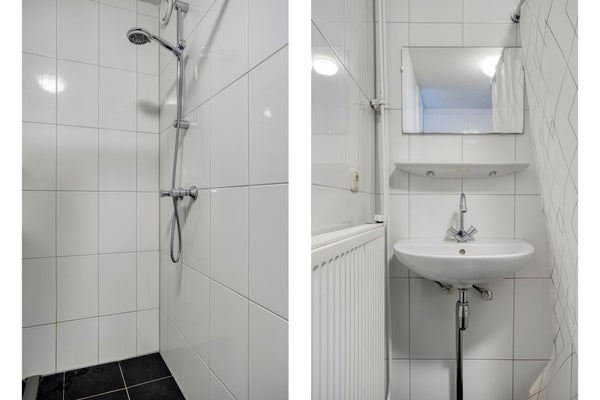 - Badkamer, v.v. wastafel, douche, radiator en wasmachineaansluiting. De badkamer is zowel via slaapkamer 1 als via de hal/gang te bereiken. Dit biedt de mogelijkheid om de deur in de slaapkamer niet te gebruiken en in plaats hiervan extra opbergruimte in de slaapkamer te creëren.