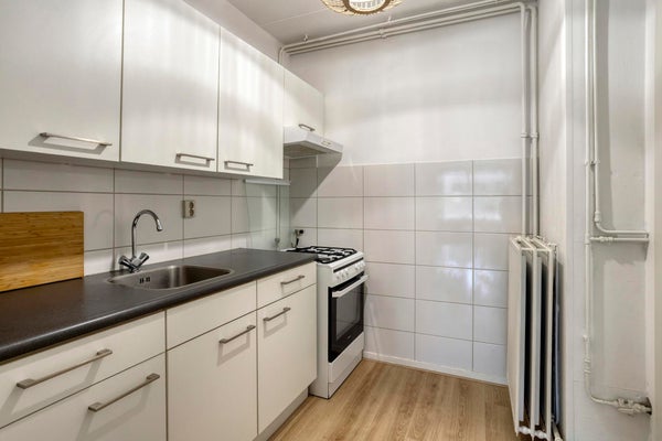- De (semi-)open keuken is recentelijk vernieuwd en beschikt over een gasfornuis met oven, afzuigkap en veel kastruimte. In een van die muurkasten bevindt zich de CV-installatie.