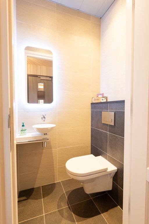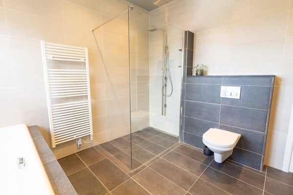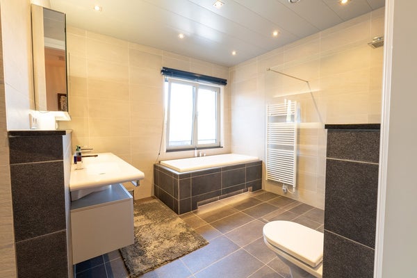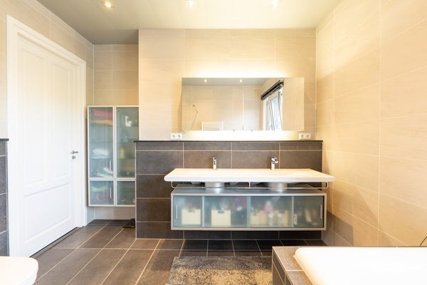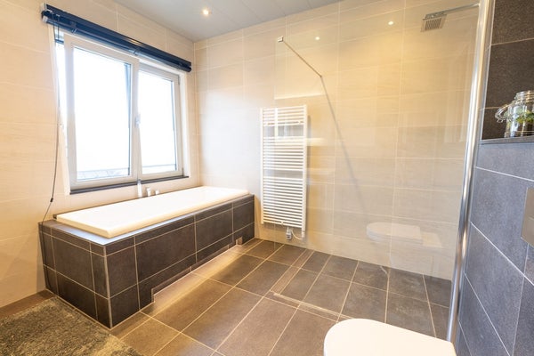 De moderne en complete badkamer is een oase van rust. Hij is voorzien van een comfortabel ligbad, een royale inloopdouche en een dubbele wastafel met twee kranen. Een tweede toilet in de badkamer zorgt voor extra comfort.