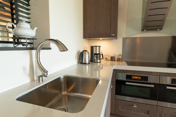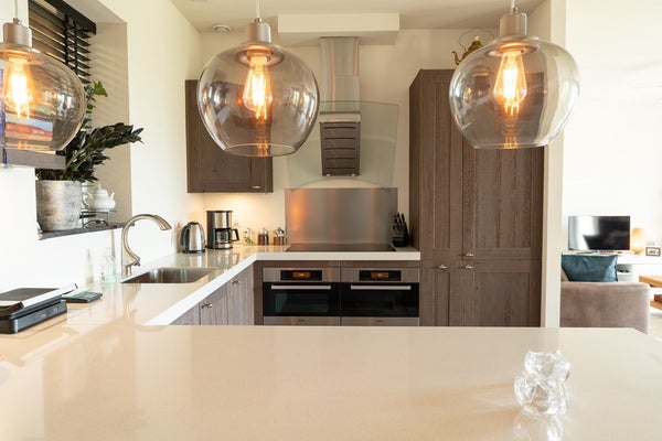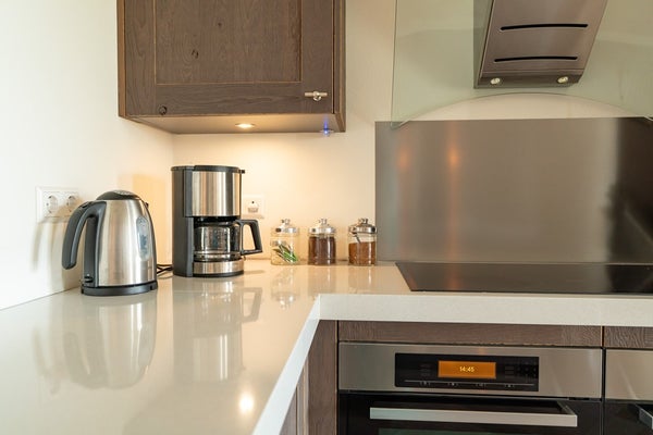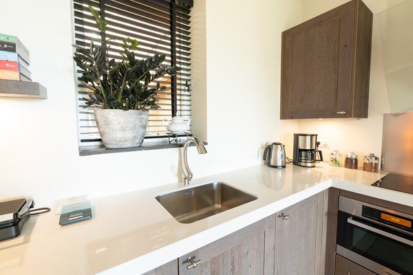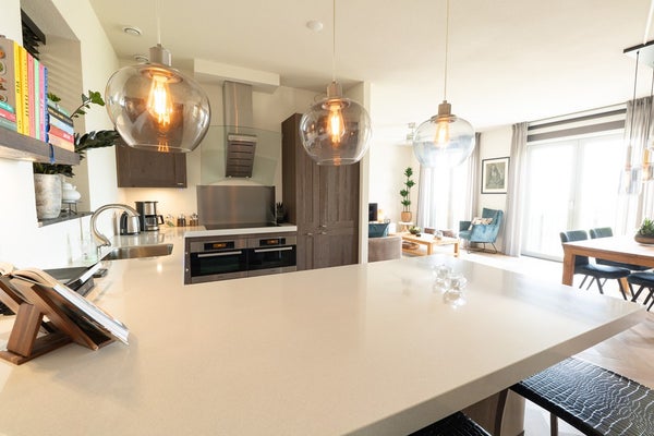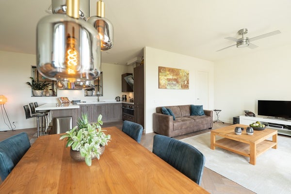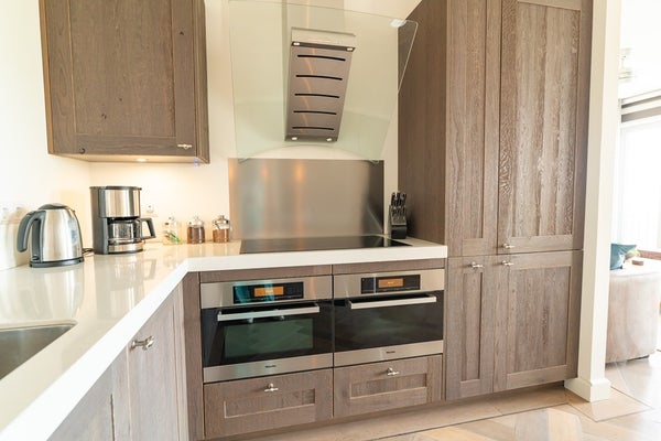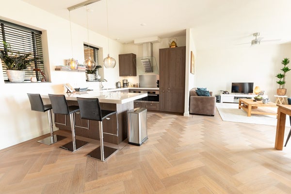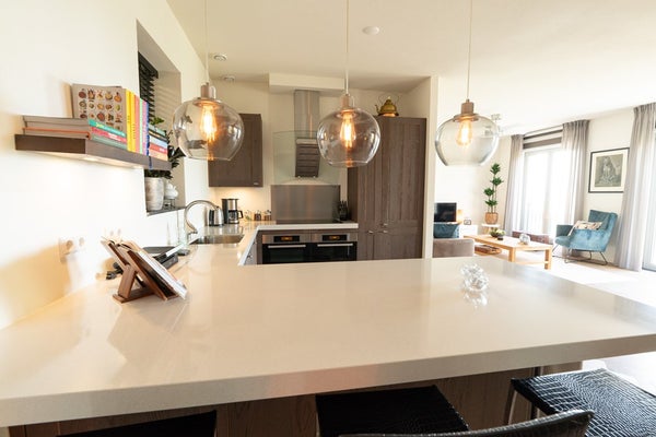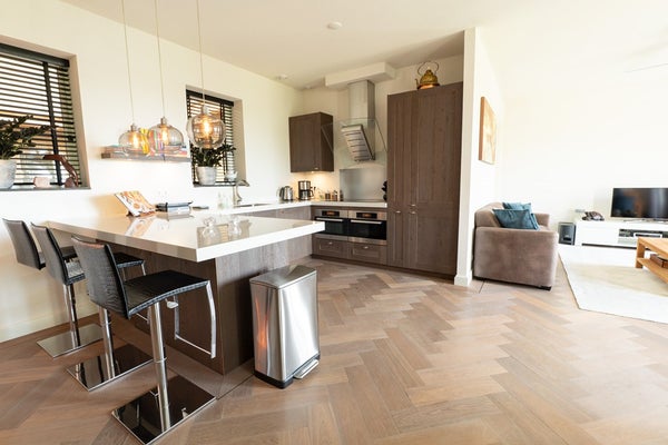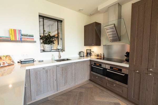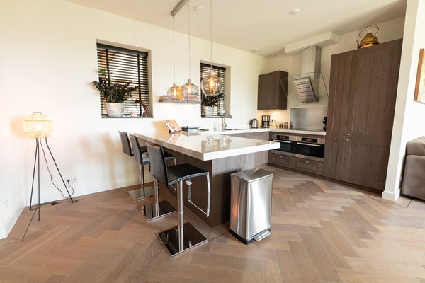 De open keuken is een luxe U-opstelling met een kookeiland dat tevens als bar dient. De houten fronten en het composiet werkblad creëren een stijlvolle en warme ambiance. De keuken is voorzien van hoogwaardige Miele inbouwapparatuur, waaronder een vaatwasser, combi-magnetron, stoomoven, koelkast en vriezer, waardoor koken hier een waar genot is.