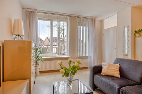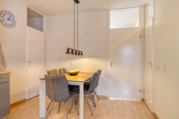 De woonkamer is licht en comfortabel en afgewerkt met een laminaatvloer. Dankzij de grote raampartijen aan de voorzijde voelt de ruimte prettig en open aan. Er is voldoende plek voor zowel een zithoek als een eethoek.