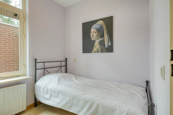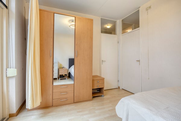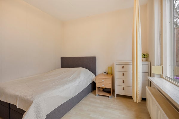 De eerste slaapkamer is ruim en licht en gelegen aan de achterzijde van het appartement. Deze kamer beschikt over een deur én raam naar de tuin en is voorzien van rolluiken, wat zorgt voor extra comfort en privacy.