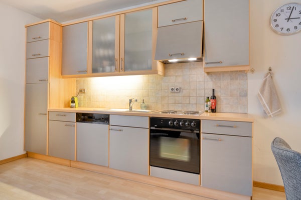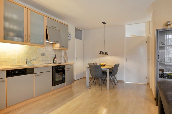 De open keuken sluit naadloos aan op de woonkamer en is uitgevoerd in een praktische wandopstelling. De keuken is voorzien van diverse inbouwapparatuur, waaronder een vaatwasser, oven, keramische kookplaat, afzuigkap, koelkast en vriezer. Een fijne, functionele keuken met voldoende werk- en bergruimte.