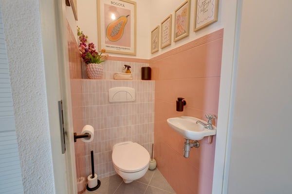 Upon entering, you step into the spacious hallway featuring a staircase to the upper floor, a practical under-stairs storage cupboard and a neat separate toilet with wall-mounted closet and washbasin. From the hallway, you access the inviting living room, finished with a beautiful laminate floor and neatly finished walls. At the rear, there is access to the indoor storage room, and the sliding doors lead to the sunny northeast-facing balcony.