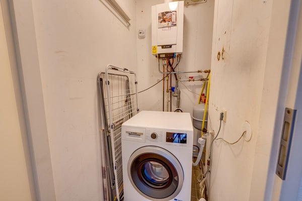 The modern bathroom is centrally located on this floor and stylishly finished. At the front of the property, you will find the space for the washing machine, dryer and the central heating boiler (2019).