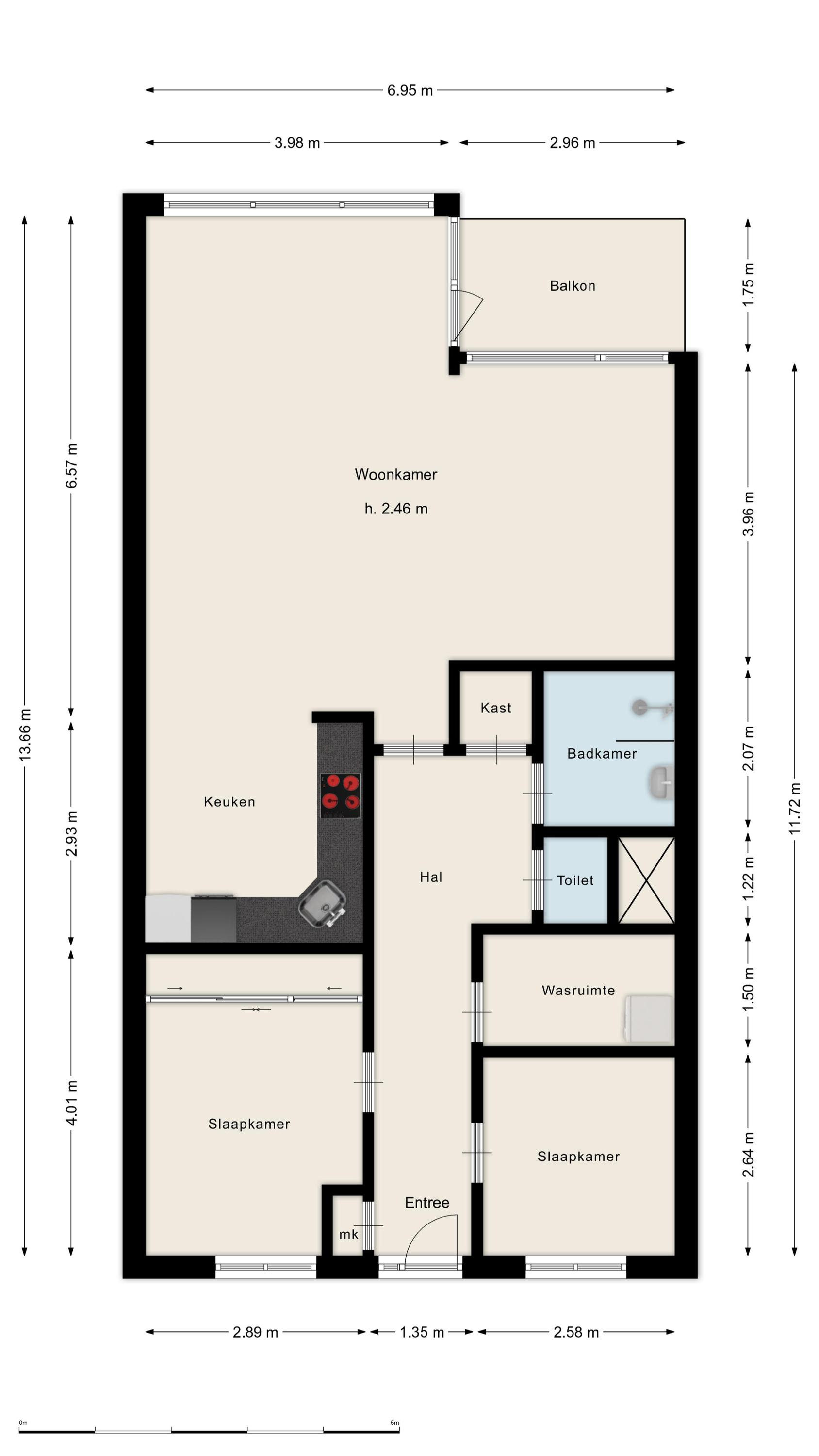 - De galerijflat heeft een woonoppervlakte van 88 m² en beschikt over 3 kamers, waarvan 2 slaapkamers;
