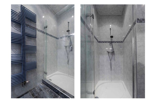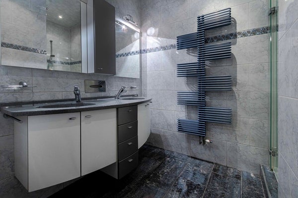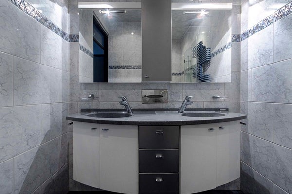 De badkamer is uitgerust met een dubbele wastafel, douche en radiator. Het toilet is separaat en voorzien van een zwevend toilet met fonteintje.