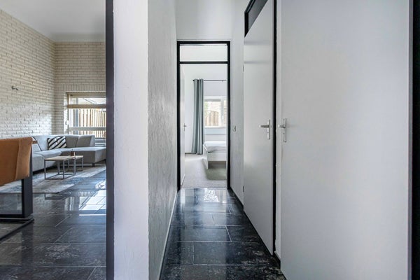 We betreden de woning via een overdekte entree. Direct vallen de mooie karakteristieke elementen op, zoals de hoge plafonds die door de gehele woning zorgen voor een ruimtelijk gevoel. De woning is grotendeels voorzien van een stijlvolle tegelvloer met marmerlook. Vanuit de hal zijn de woonkamer, twee slaapkamers, het toilet en de badkamer bereikbaar. De meterkast bevindt zich aan de buitenzijde, naast de voordeur.