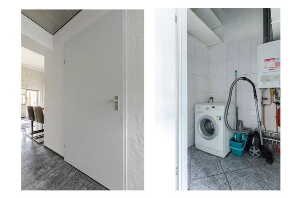 De keuken in hoekopstelling is gesitueerd aan de straatzijde en voorzien van diverse inbouwapparatuur, waaronder een inductiekookplaat, afzuigkap, vaatwasser, koelkast en combimagnetron. Aansluitend bevindt zich de berging met de opstelplaats van de cv-ketel en wasmachine, tevens ideaal als extra bergruimte.