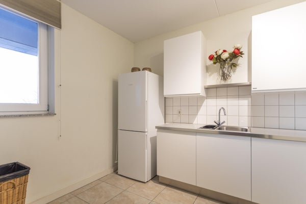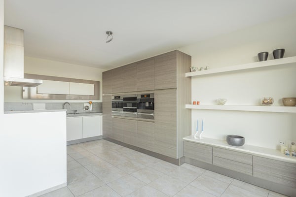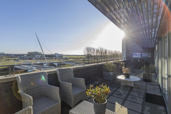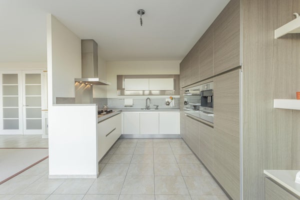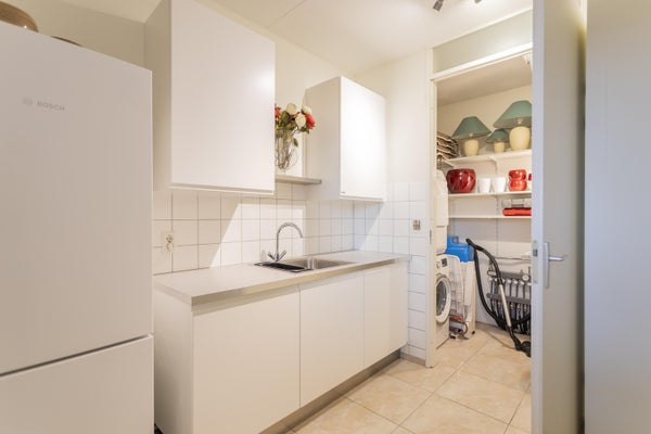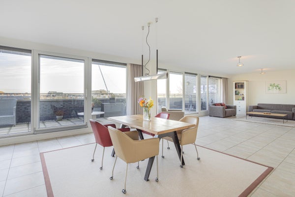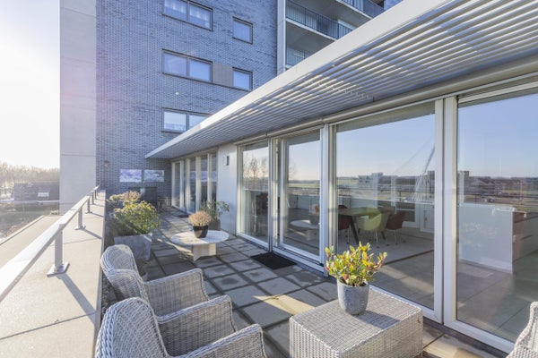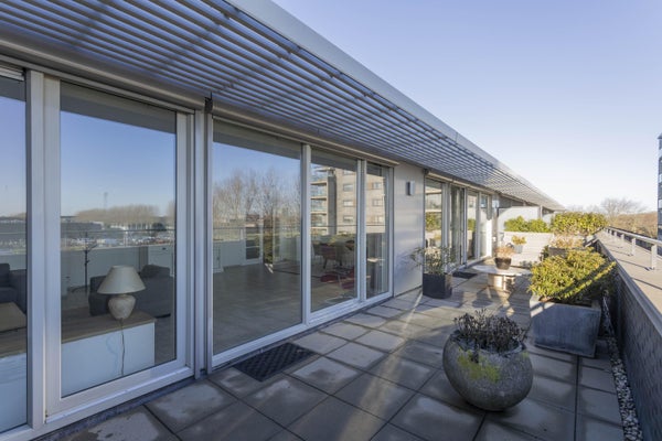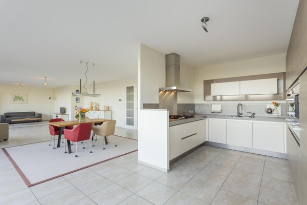 U betreedt het gebouw via de afgesloten entree met video-intercom en toegang tot de garage. Op de 3e etage komt u binnen via een ruime galerij. De hal biedt toegang tot een praktische bijkeuken en het aparte toilet. De woonkamer met open keuken vult de hele breedte van het appartement en heeft twee schuifpuien naar het dakterras. De moderne open keuken is luxe uitgevoerd met diverse apparatuur.