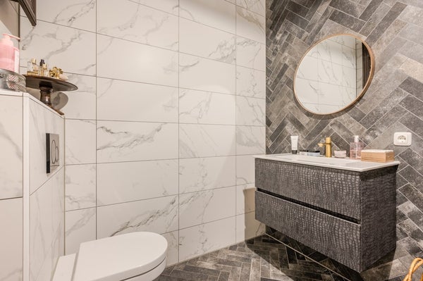 De grote en moderne badkamer is voorzien van grijze en witte tegels.