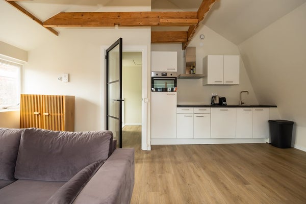 Vanuit de hal geeft een moderne deur met glas toegang tot de sfeervolle living. Alle wanden zijn strak gesausd en op de vloer ligt pvc met vloerverwarming. Wat dit appartement zo sfeervol maakt is het hoge plafond en de houten balken die in het zicht zijn gehouden. 2 Dakkapellen met HR++ glas in de nieuwe kozijnen geven heel veel en prettig lichtinval.