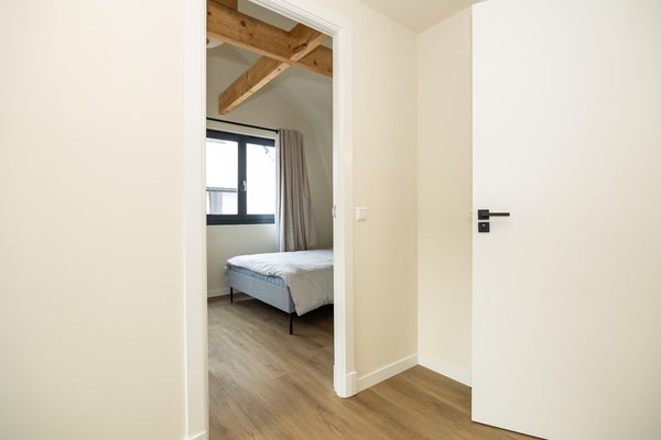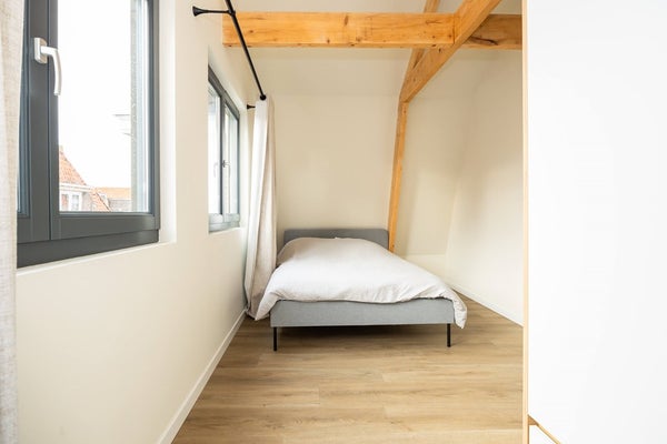 Sfeervolle slaapkamer met ook hier een hoog plafond en de karakteristieke balken in het zicht gehouden. 2 kozijnen met een draai/kiepraam en HR++ glas in een hardhouten kozijn geven ook hier veel lichtinval en je kan ook goed ventileren.