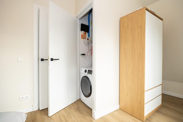 In deze kamer is een vaste kast met de cv-installatie en de wasmachine die bij het appartement wordt geleverd. De raambekleding blijft hier ook achter.