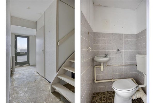 Bij binnenkomst word je welkom geheten in een lichte hal, die toegang geeft tot het toilet, de trap naar boven, en de woonkamer. De woonkamer biedt volop ruimte voor een gezellig zitgedeelte en eventueel een sfeervolle werk- of eethoek. Aan de voorzijde van de woning bevindt zich het keukenblokje, dat vraagt om een frisse update. Hier kun je jouw droomkeuken realiseren, voorzien van alle comfort en luxe die je wenst.