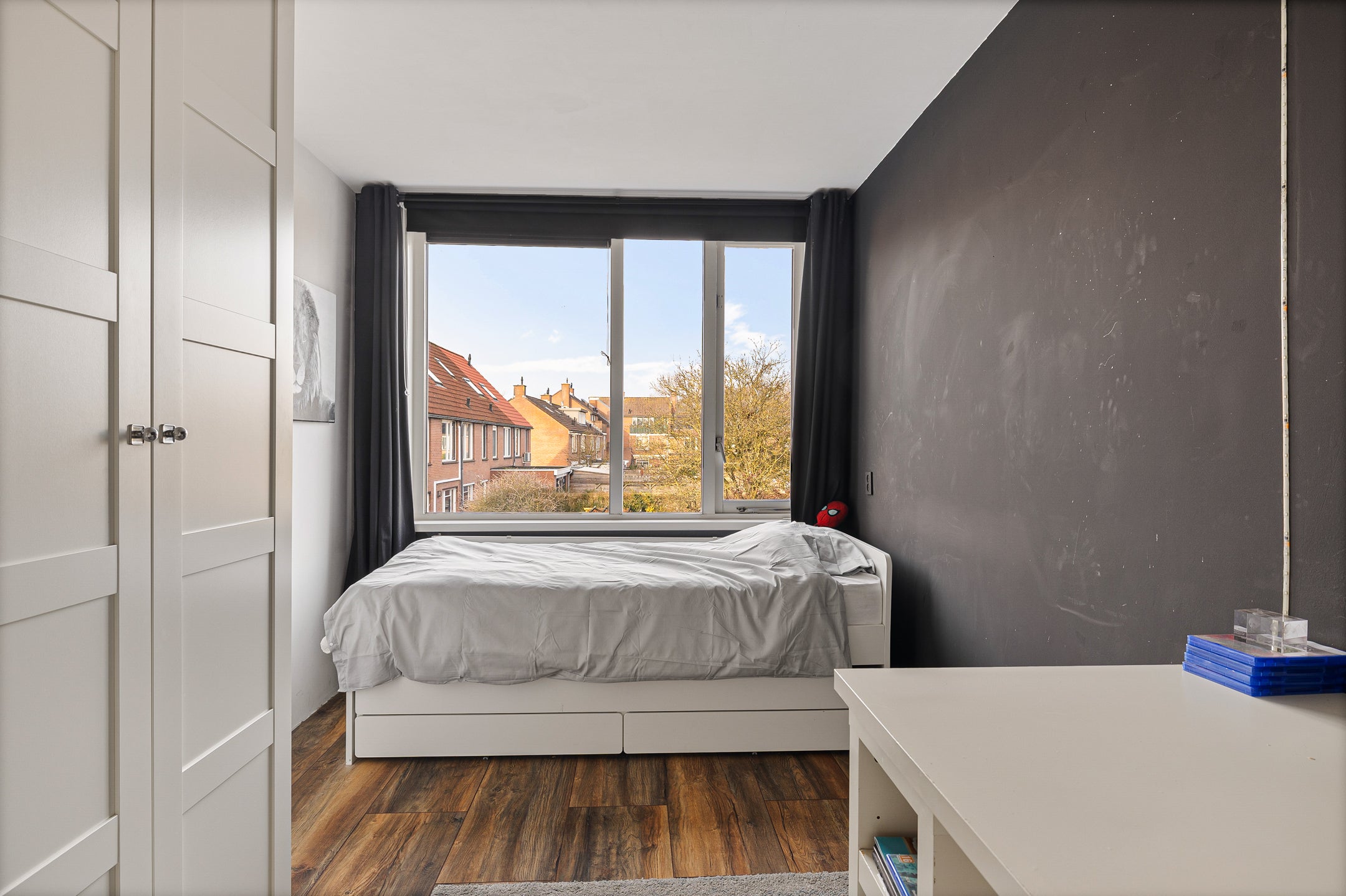 De diepte van de achtertuin op het noordwesten maakt het een fijne plek om buiten te zitten, compleet met een overkapping en stenen berging. Op de verdieping bevinden zich drie slaapkamers en een badkamer. Naast het winkelcentrum Oostermeent zijn scholen en openbaar vervoer dichtbij, en binnen enkele minuten fietsen bereik je het Surfstrand van Huizen.