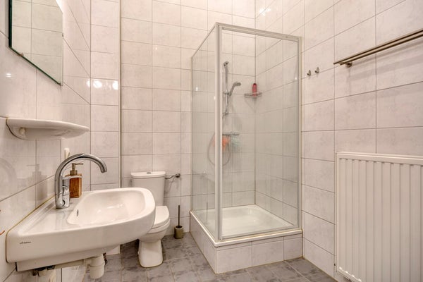 Naast de woonkamer is een slaapkamer (2,7 x 2,5m) aan de achterzijde van het appartement. Hiernaast is de ruime badkamer met douchecabine, tweede toilet en wastafel. Naast de badkamer is de masterbedroom (3,8 x 3,9m).