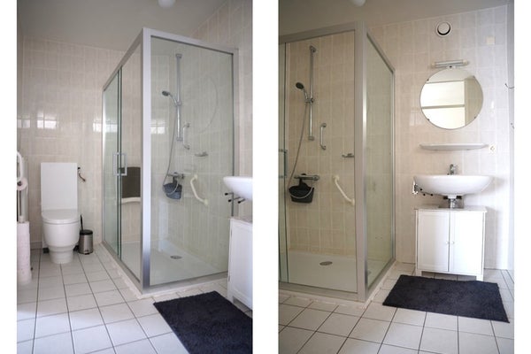 De badkamer is voorzien van en royale en vlakke douchecabine, 2e toilet en een wastafel.