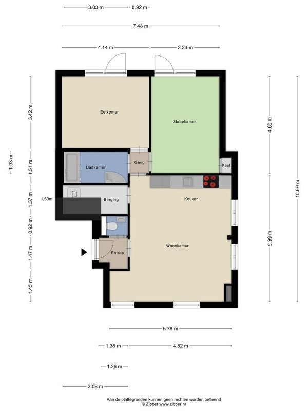 Begane grond: entree, gangzone, toilet, woonkamer, keuken, douche;