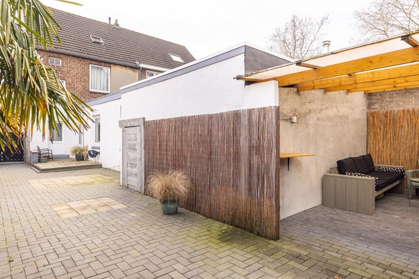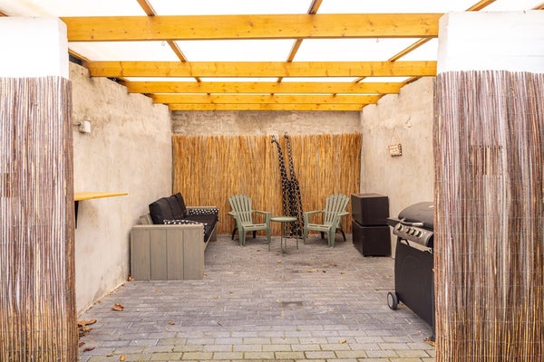Bij de onderwoning hoort een berging, voorzien van verlichting en elektra, ideaal voor extra opslag. Daarnaast is er een bergkelder, die wordt gedeeld met de bovenwoning en geschikt is voor het opbergen van voorraad of overige spullen. De tuin is volledig bestraat en onderhoudsvriendelijk aangelegd. Achterin bevindt zich een overkapping met licht doorlatende dakplaten, waar je beschut en in alle privacy kunt zitten. Een fijne buitenruimte met voldoende plaats voor een loungehoek en barbecue.