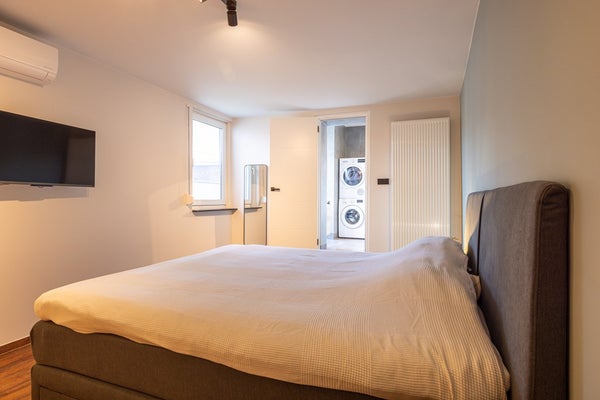 De slaapkamer is comfortabel van formaat en afgewerkt met een pvc vloer. Deze ruimte is voorzien van kunststof kozijnen met HR+ glas, een rolluik en airconditioning, wat bijdraagt aan een aangenaam binnenklimaat in alle seizoenen.
