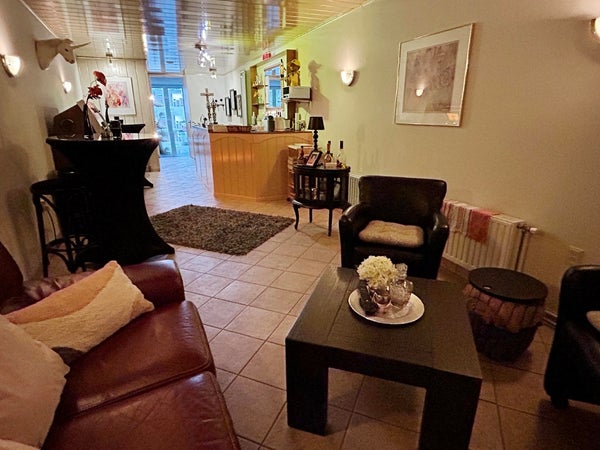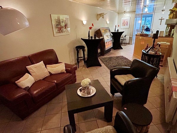 Omtspanningsruimte 9,50 x 3,40 met plavuizenvloer, elektrische kachel en compleet ingerichte bar met zitgedeelte.