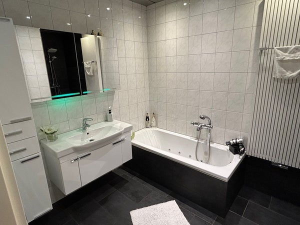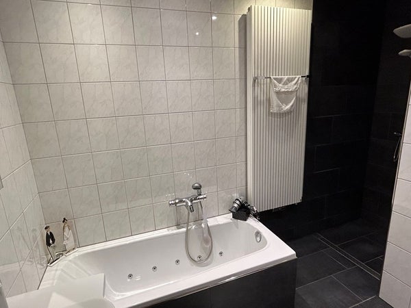 Badkamer 3,35 x 2,30/0,90 met plavuizenvloer, inbouwspots, ligbad met whirlpool, inloopdouche, badkamermeubel met 2 kranen en design radiator.
