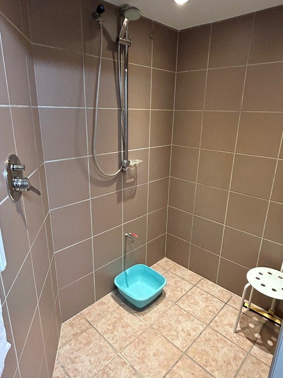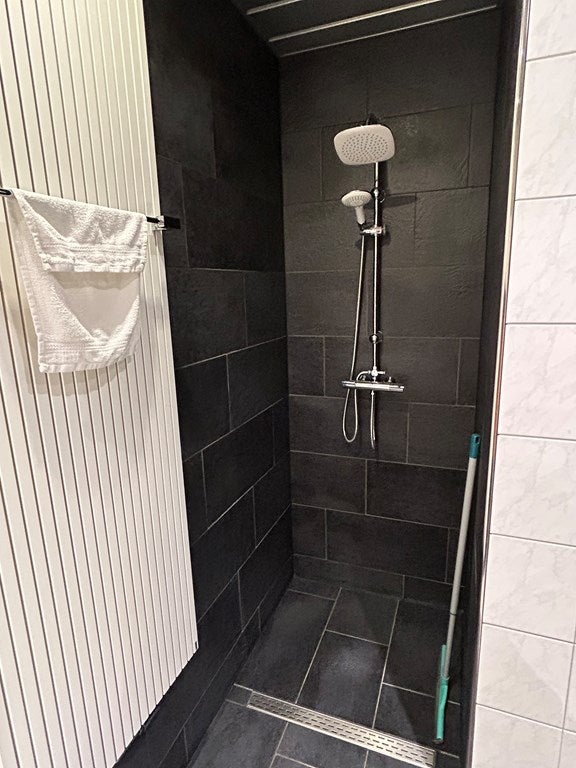 Badkamer 1,70 x 1,30 met plavuizenvloer en inloopdouche.