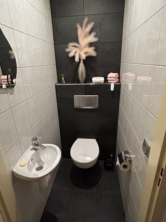 Gastentoilet 1,30 x 0,85 met plavuizenvloer, inbouwspot, hangtoilet en fonteintje.