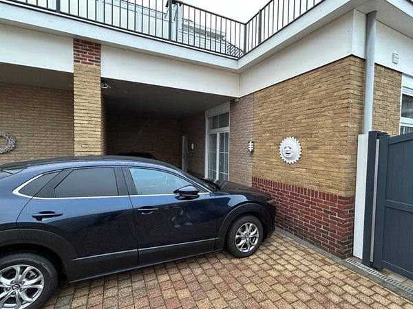 Voortuin is geheel bestraat en voorzien van carport en afsluitbare poort naar achtertuin.