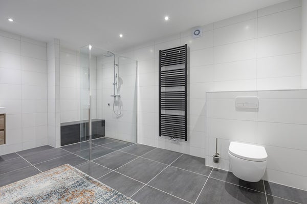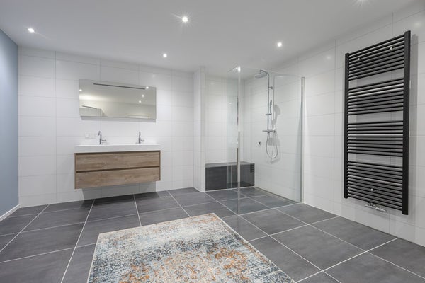 De badkamer is opvallend groot en biedt ruimte voor douche, wastafel en toilet. Een comfortabele ruimte met mogelijkheden om naar eigen wens te moderniseren of verder af te werken.