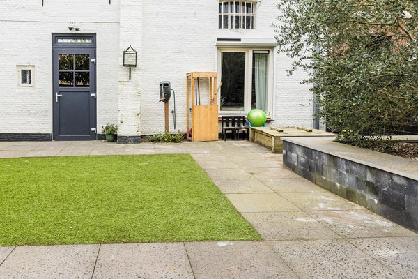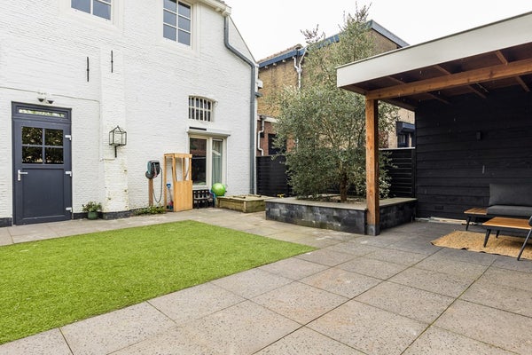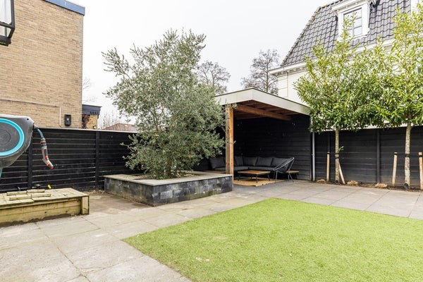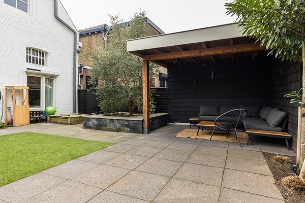 De achtertuin van ca. 55 m² is een fijne, beschutte buitenruimte. Dankzij de overkapping zit je hier al vroeg in het voorjaar en tot laat in het najaar comfortabel buiten. De achterom zorgt voor extra gemak.